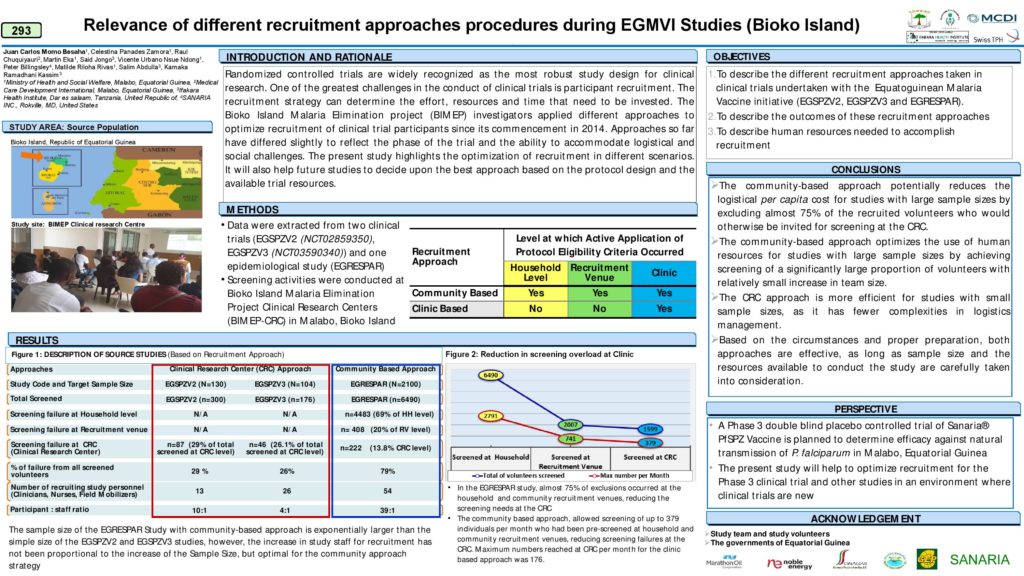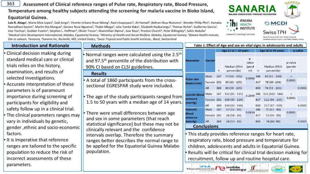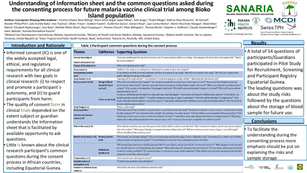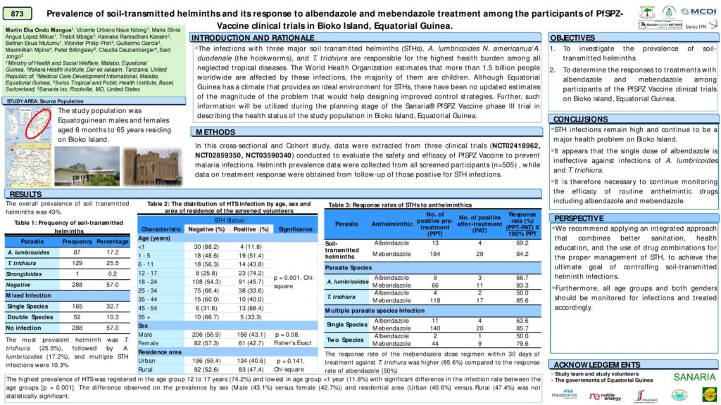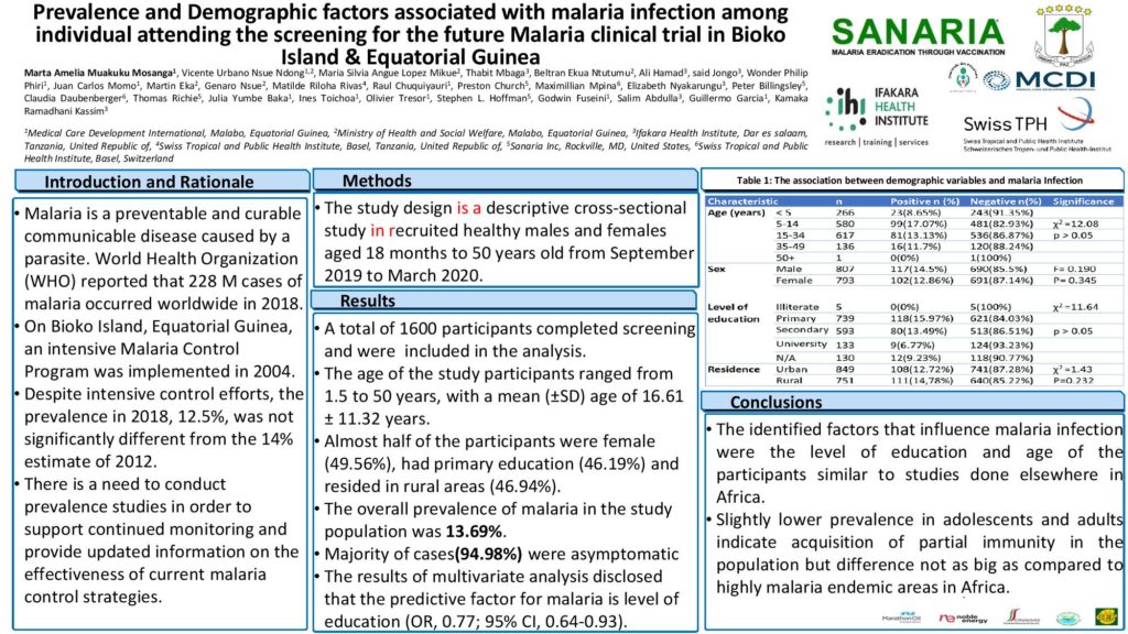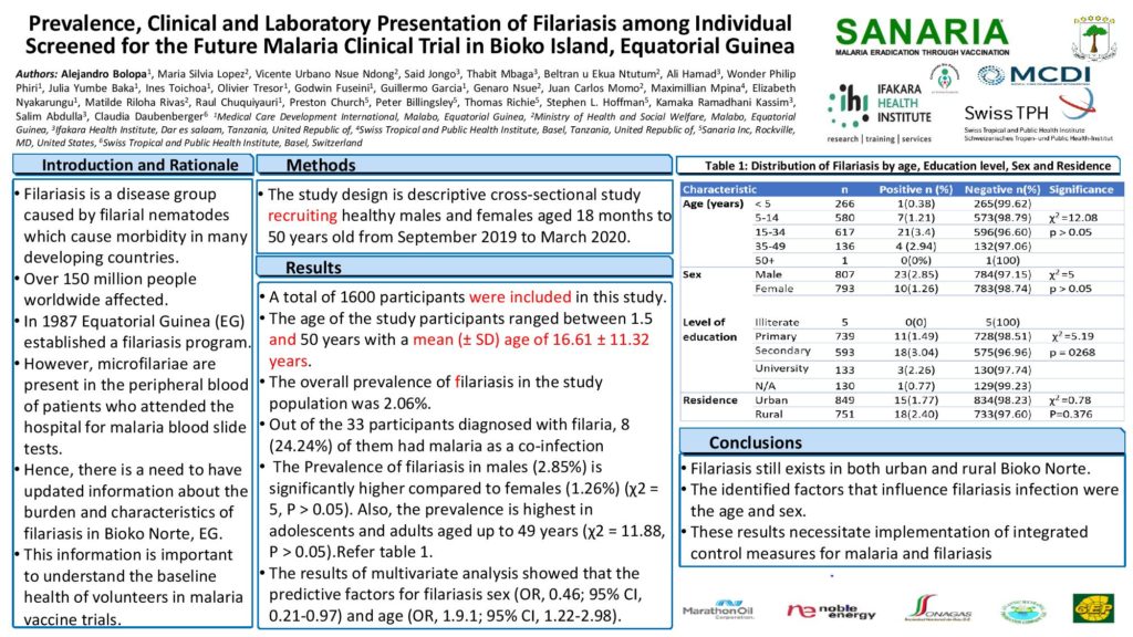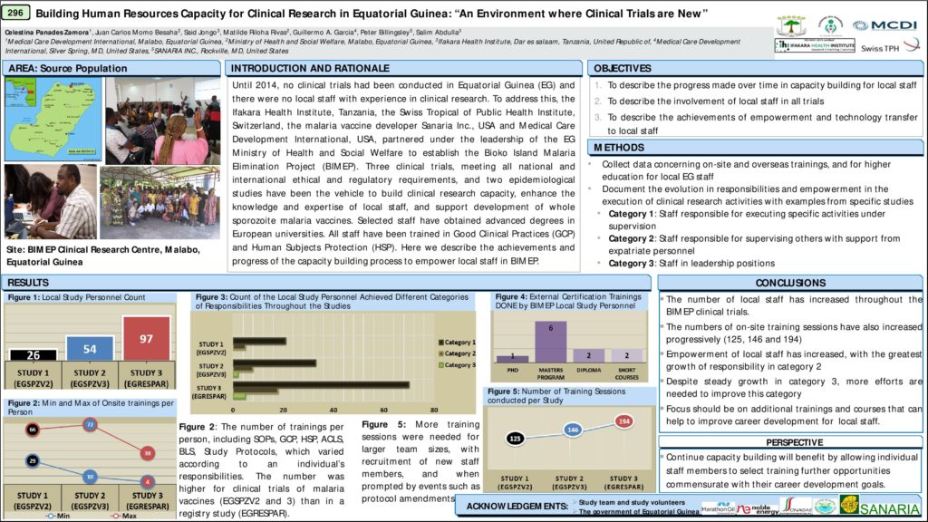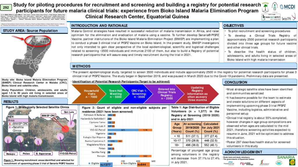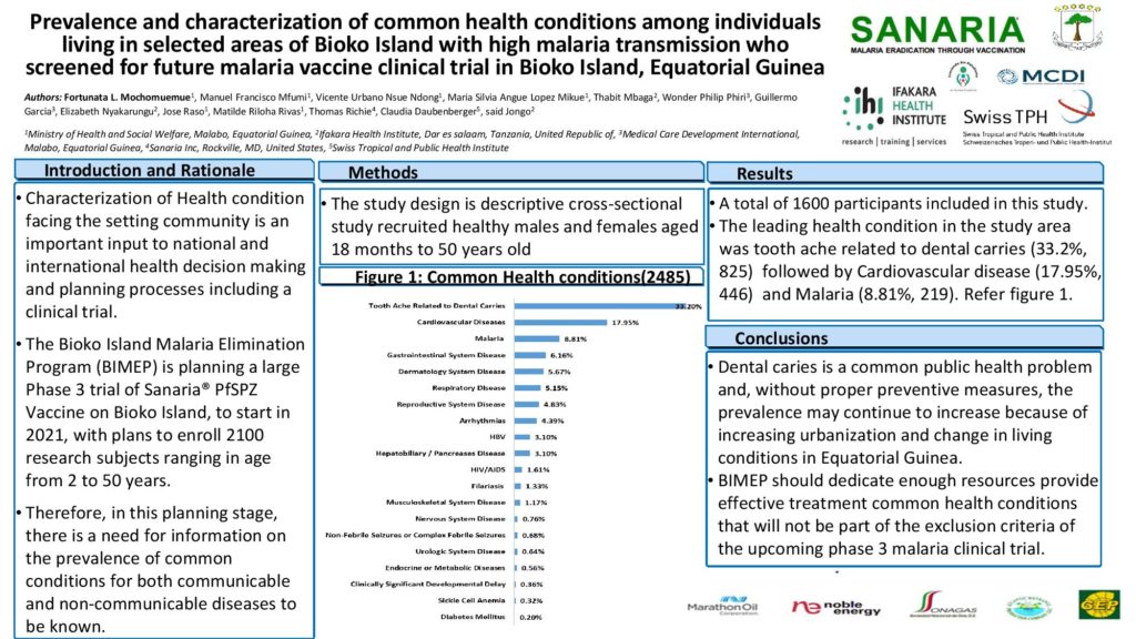 Once again, our team from Equatorial Guinea was a great presence at the ASTMH meeting. In this virtual setting, eleven posters from the BIMEP were presented during two poster sessions and the authors were available to answer questions on line. The posters described many different facets of our preparations for a Phase 3 clinical trial of PfSPZ Vaccine in Malabo in 2021. Sanaria is happy and proud to continue this strong developmental collaboration with such a wonderful team.